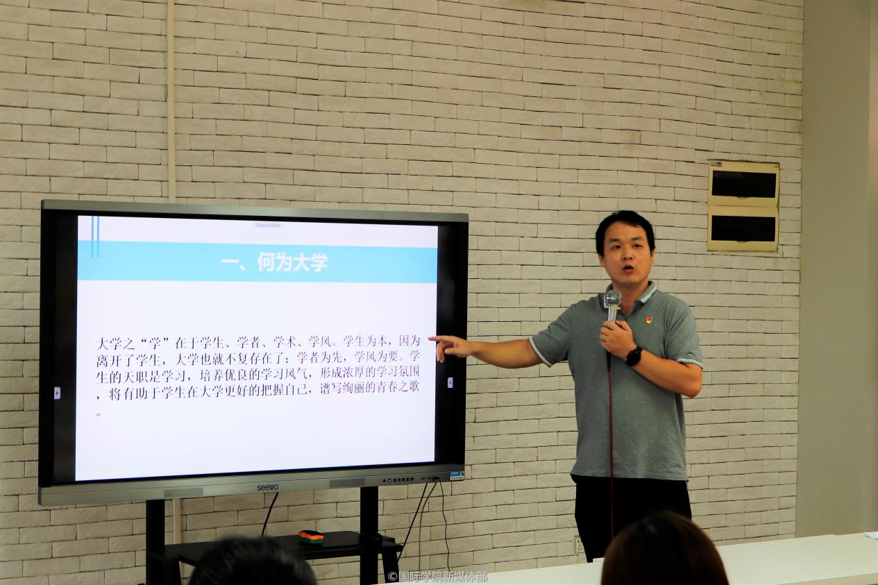 首先,杨李军老师谈到大学的含义、老员工活规划及校内注意事项。他建议新生们提前做好学业规划、以学业为主提升专业技能、合理参加课外活动、学会处理人际关系、积极锻炼身体提高身体素质。最后,他向新生提出几点要求:处理好室友关系、防传销防诈骗、遵守校规校纪,努力提高安全意识及道德修养。